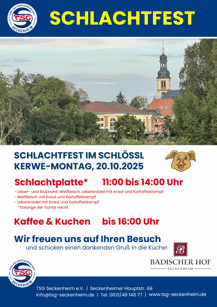 Am Kerwe-Montag, 20.10.2025 findet das TSG Schlachtfest statt: ein deftiges Herbstessen im Seckenheimer Schloss erwartet Euch! Das traditionelle Schlachtplattenessen kommt wieder vom Restaurant Badischer Hof. Los geht’s um 11:00 Uhr. Es wird auch eine vegetarische Variante geben – und bis 16:00 Uhr zudem Kaffee & Kuchen. Alle Speisen können auch mitgenommen werden – dann bitte passende Essensboxen mitbringen.