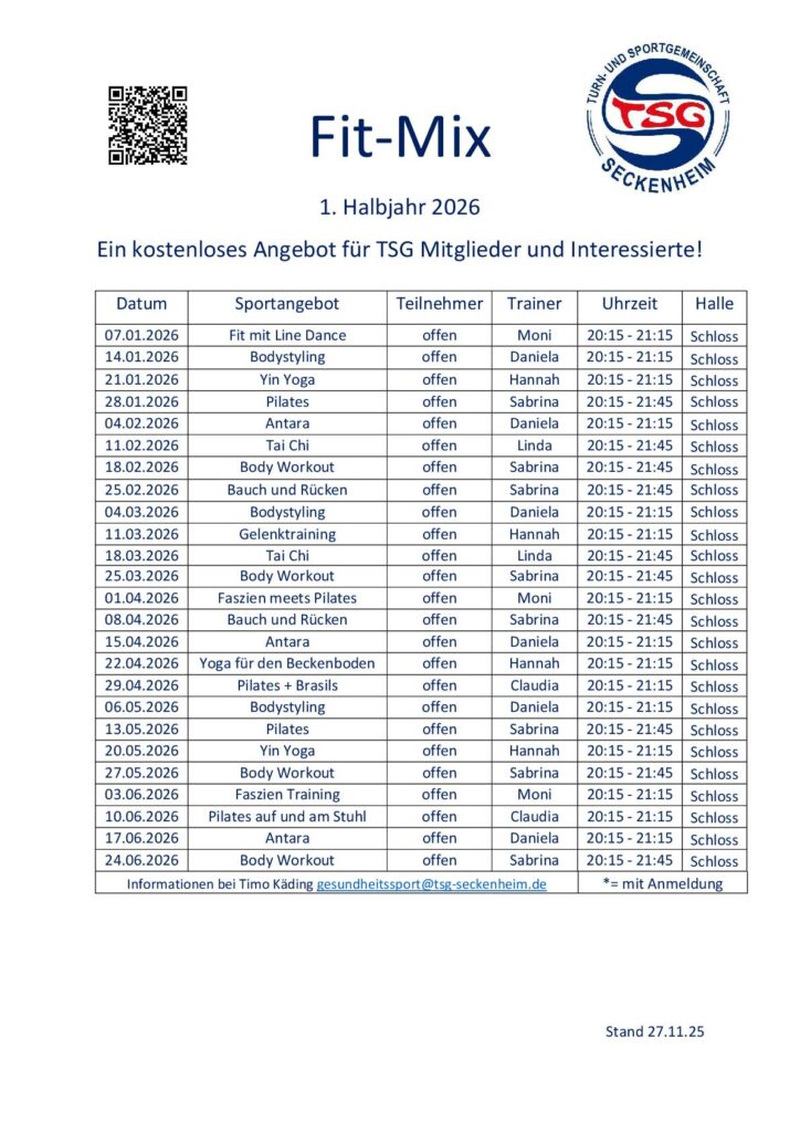 Die Fit-Mix Gruppe trifft sich jeden Mittwoch um 20:15 Uhr. Das abwechslungsreiche Sportangebot setzt sich aus bestehenden Kursen der Gesundheitssportabteilung zusammen. Durch die wöchentliche Rotation der Übungsleiter werden Inhalte in verschiedenen Bereichen der Fitnesswelt geboten. Von Power bis Entspannung ist alles dabei. Hier findet jeder seinen Sport!