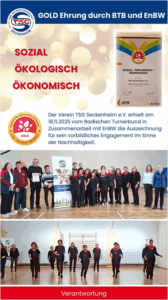 Wir sind mächtig stolz: Die TSG Seckenheim wurde im Bereich Nachhaltigkeit mit GOLD ausgezeichnet! Der Badische Turnerbund (BTB) hat am 18.11.2025 in Zusammenarbeit mit der