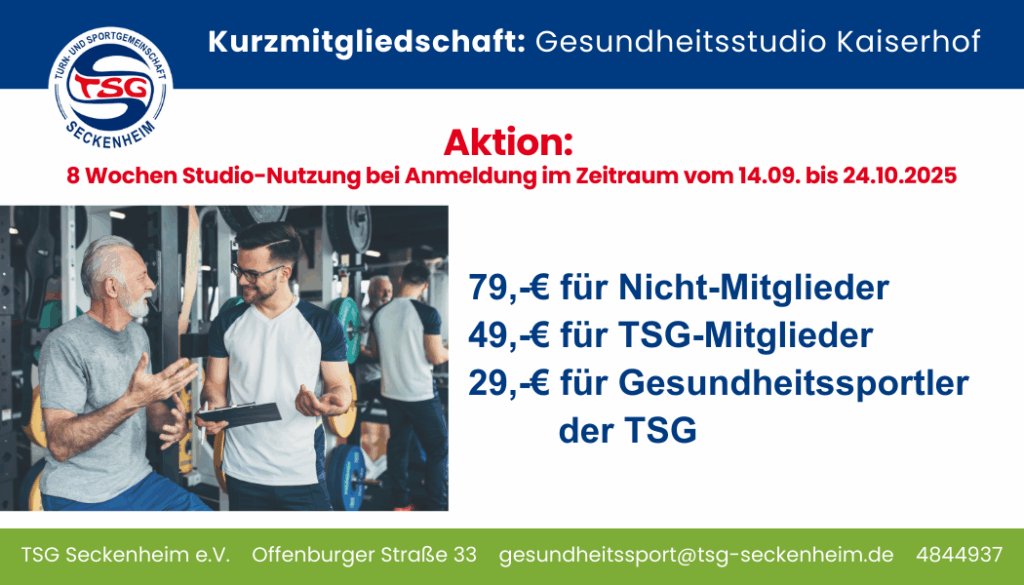 Start am 14.09.25 Wir bieten eine 8-wöchige Kurzmitgliedschaft ohne vertragliche Bindung für Interessenten des Gesundheitsstudios. Nach Ihrer Anmeldung zwischen dem 14.09.25 und 24.10.25, bekommen Sie die Möglichkeit das Studio für 8 Wochen zu nutzen und sich von der Leistung unseres Studios zu überzeugen. In einem Vorgespräch gehen wir explizit auf Ihre Herausforderungen, Probleme und Ziele […]