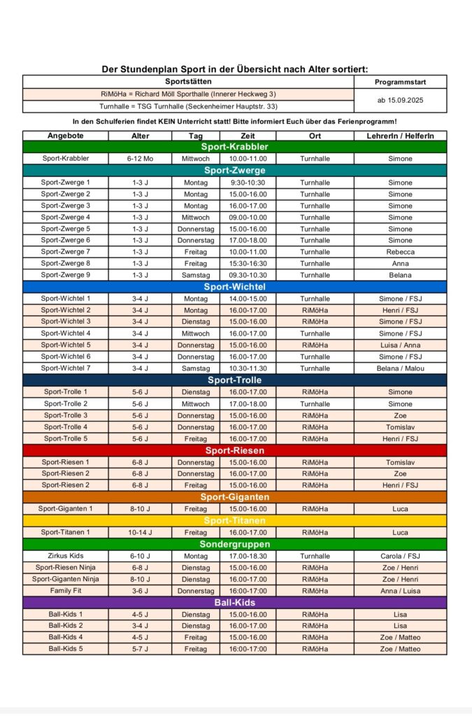 Wir bieten ein umfangreiches Sportprogramm für Kinder und Jugendliche in jedem Alter an. Von Eltern-Kind-Gruppen (0-3 Jahre) bis Sportgruppen in den Altersbereichen 3-4 Jahre, 5-6 Jahre, 6-8 Jahre, 8-10 Jahre und 10-14 Jahre. Dabei soll ein vielseitiges und sportartübergreifendes Bewegungsprogramm einer frühzeitigen Spezialisierung entgegenwirken und Spaß sowie Freude am Sport vermitteln.