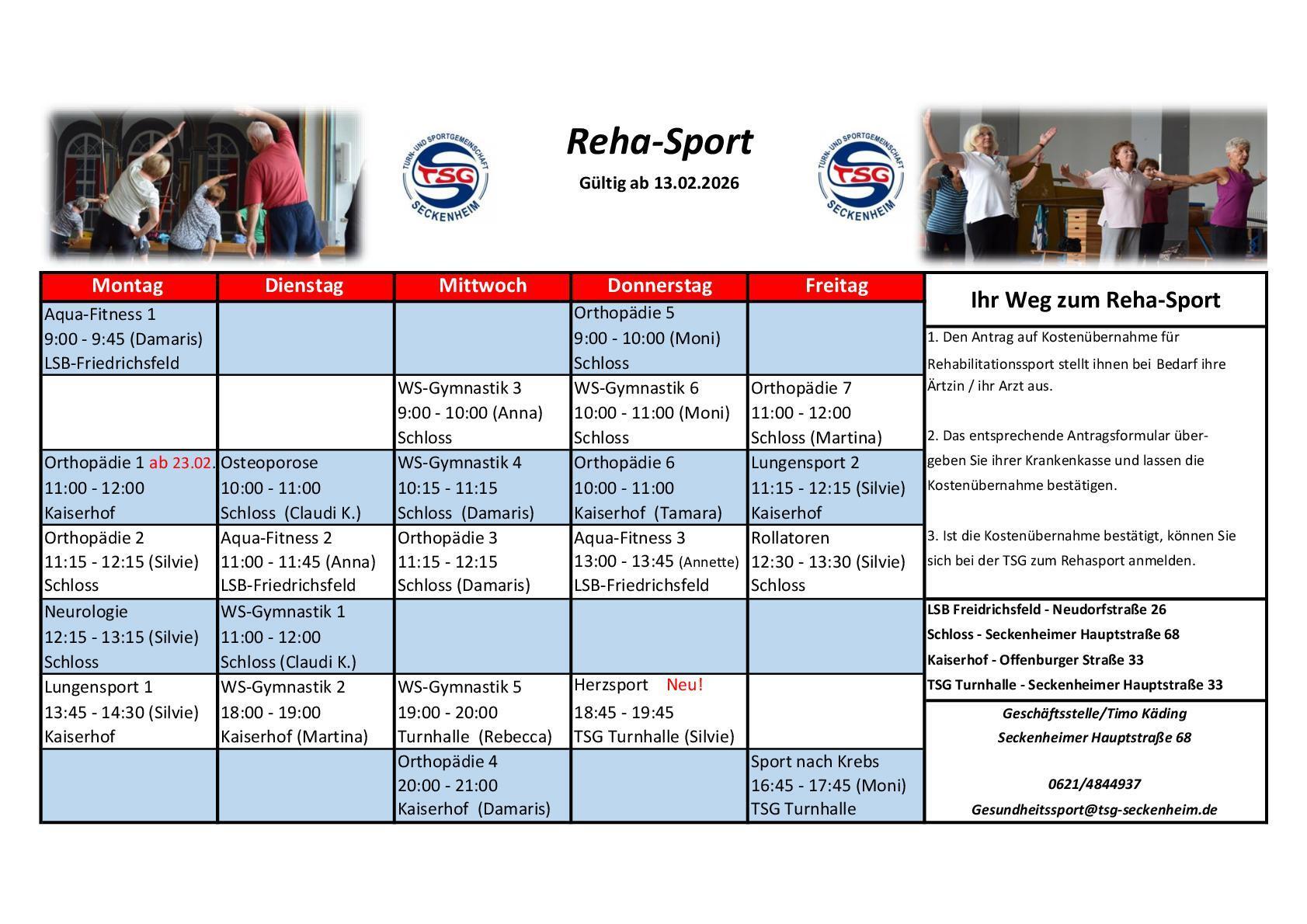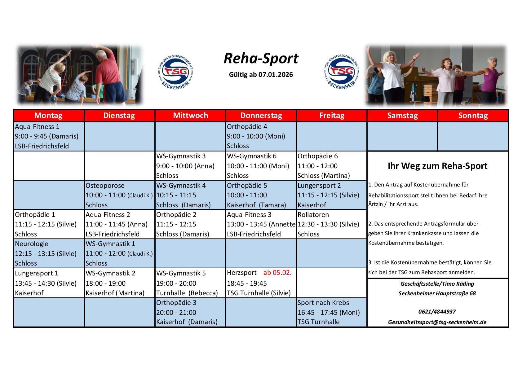 Reha-Sport wird nach einer Rehabilitation, Physiotherapie oder auf Empfehlung des behandelnden Arztes zum (Wieder-)Einstieg in den Sport verordnet. Nach Genehmigung durch die Krankenkasse, bzw. des Rentenversicherungsträgers ist die Teilnahme am Reha-Sport kostenfrei. Der Verein übernimmt die Abrechnung mit der Krankenkasse. Privatversicherte erhalten eine entsprechende Rechnung, die bei der zuständigen Kasse eingereicht werden kann.