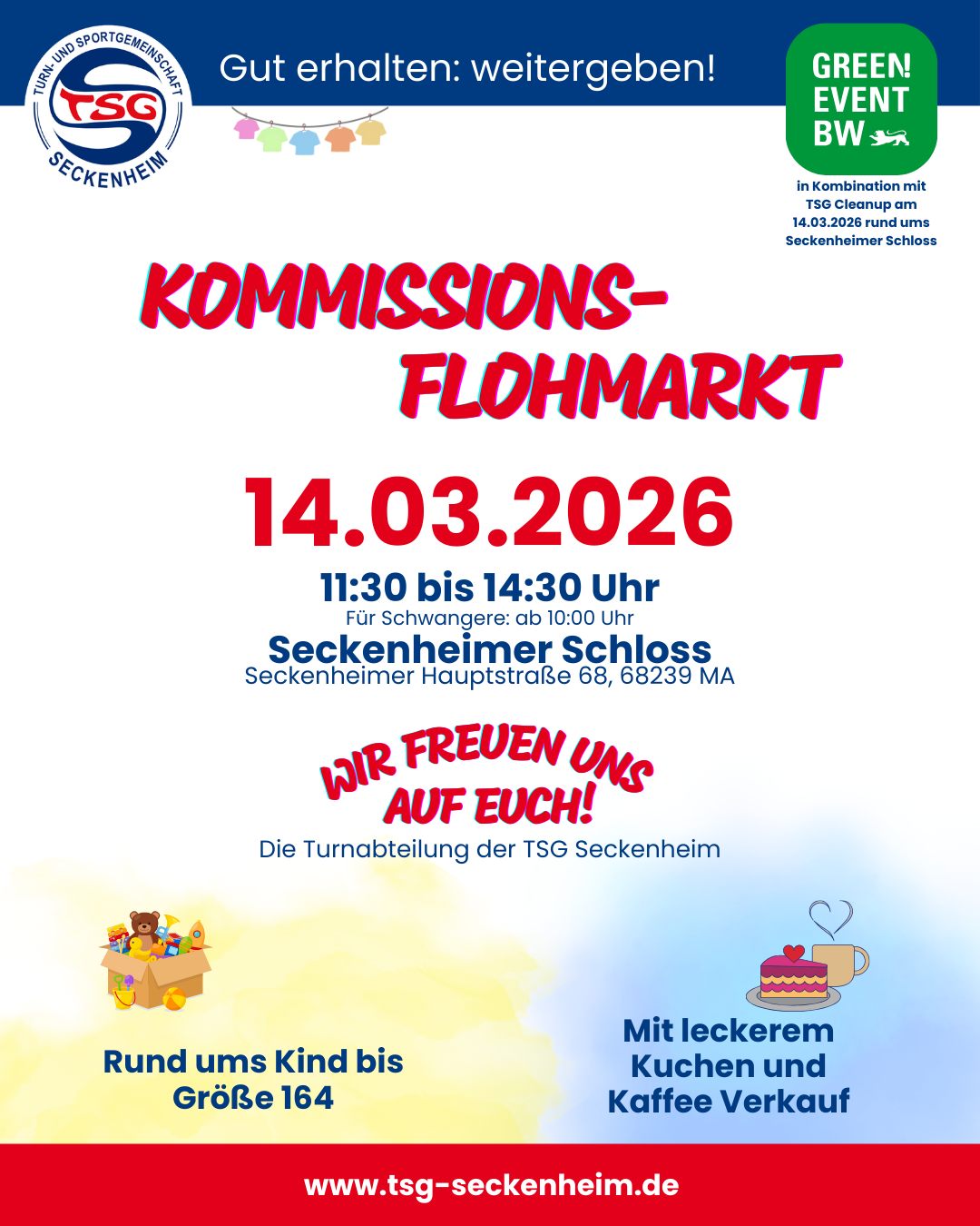 Am 14. März 2026 findet der nächste Flohmarkt unserer Turnabteilung im Seckenheimer Schloss statt: Kommt vorbei und stöbert Euch durch alles "rund ums Kind bis Größe 164". 💚