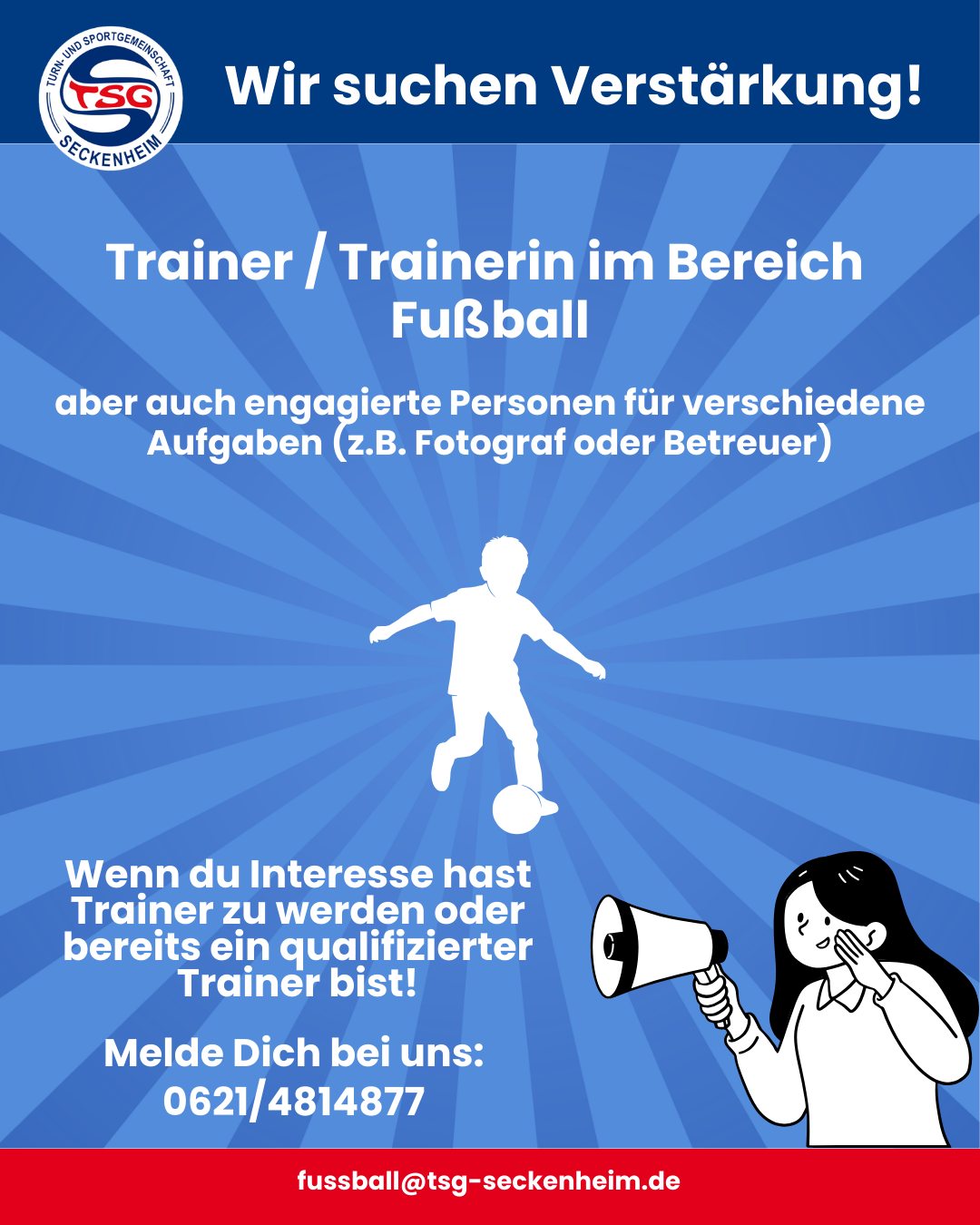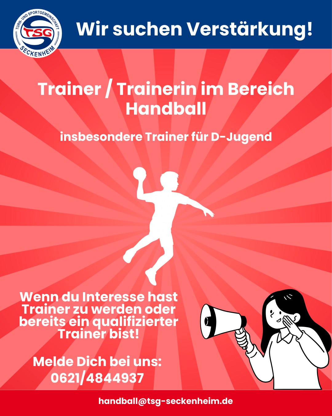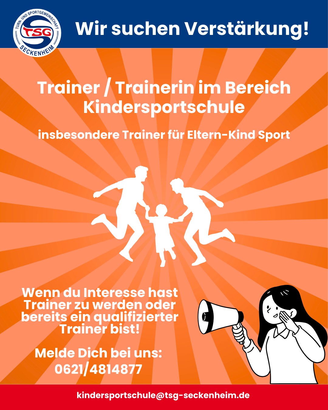 Die TSG Seckenheim sucht engagierte Trainerinnen und Trainer – bei Interesse einfach bei uns melden!