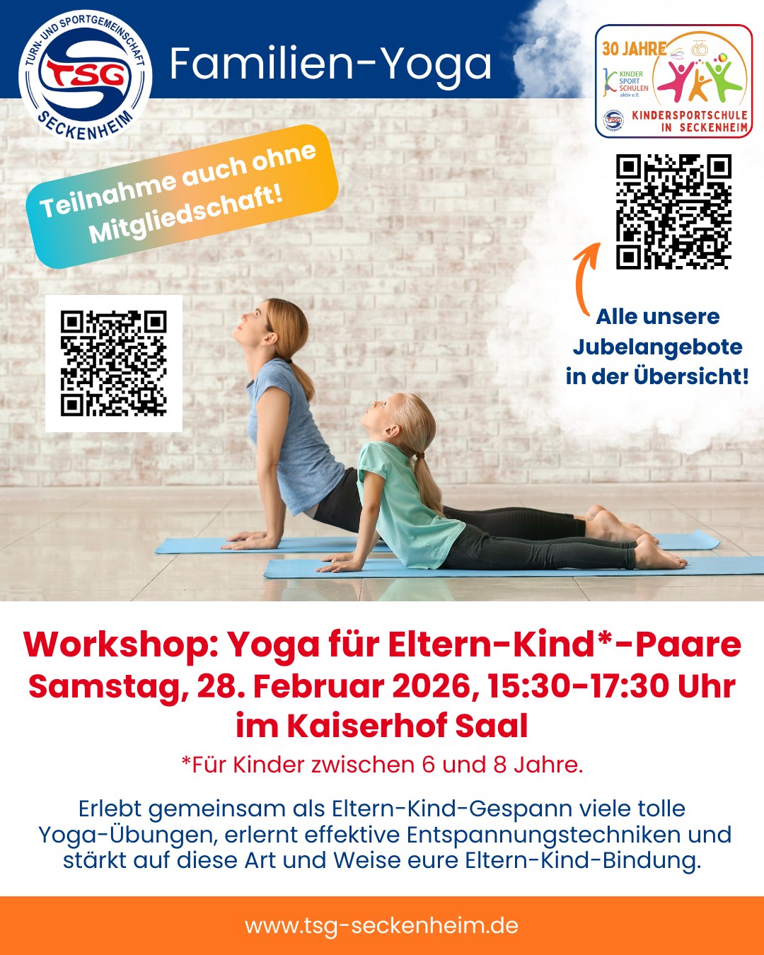 🧘♀️✨ Gemeinsam wachsen. Gemeinsam entspannen ✨🧘♂️ Unter diesem Motto findet unser Yoga-Workshop für Eltern-Kind-Paare am 28.02.2026 im Kaiserhof Saal in Seckenheim statt.