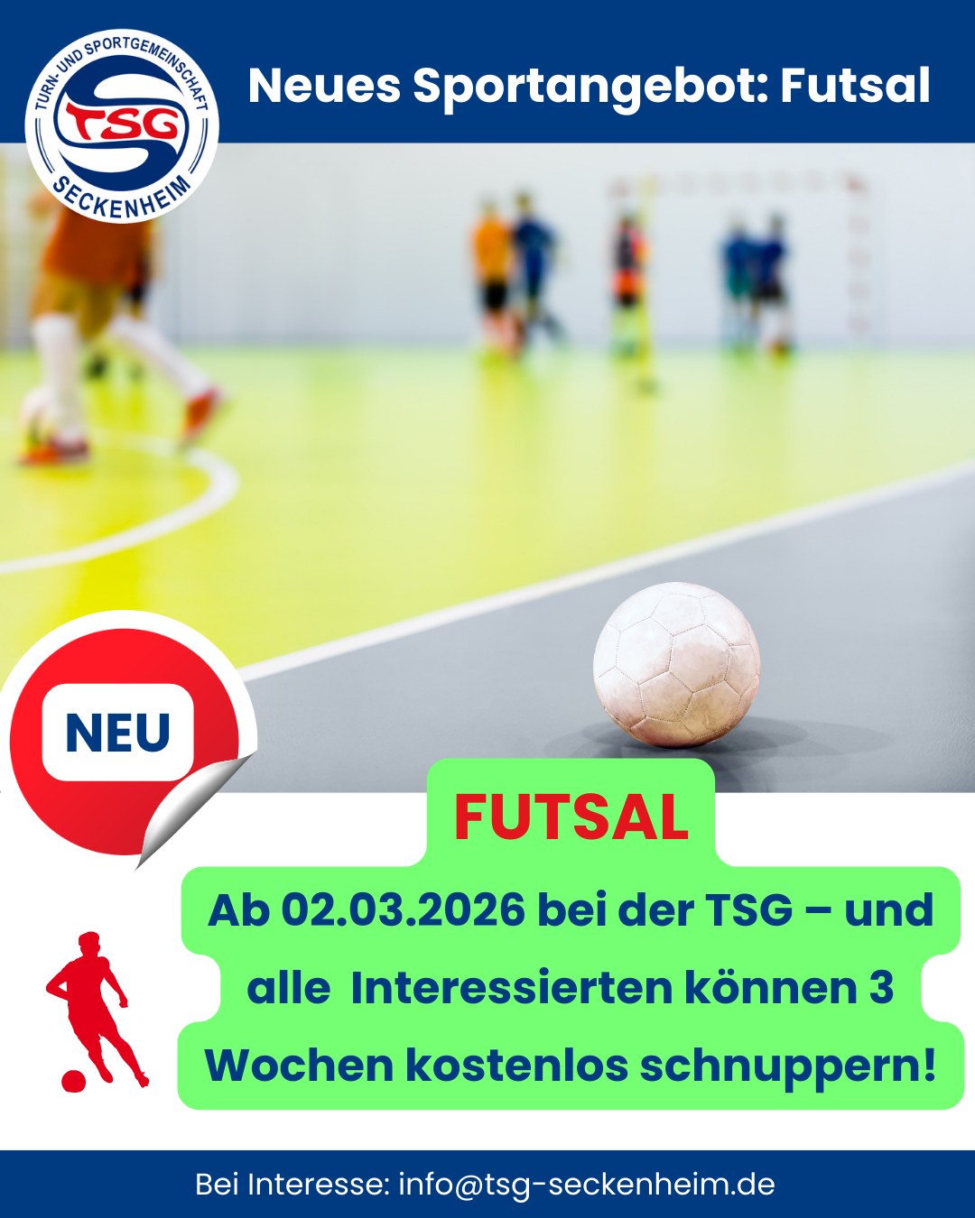 Meldet euch einfach unter: info@tsg-seckenheim.de an. Kommt vorbei, probiert es aus und werdet Teil unserer neuen Futsal‑Gruppe – wir freuen uns auf euch!