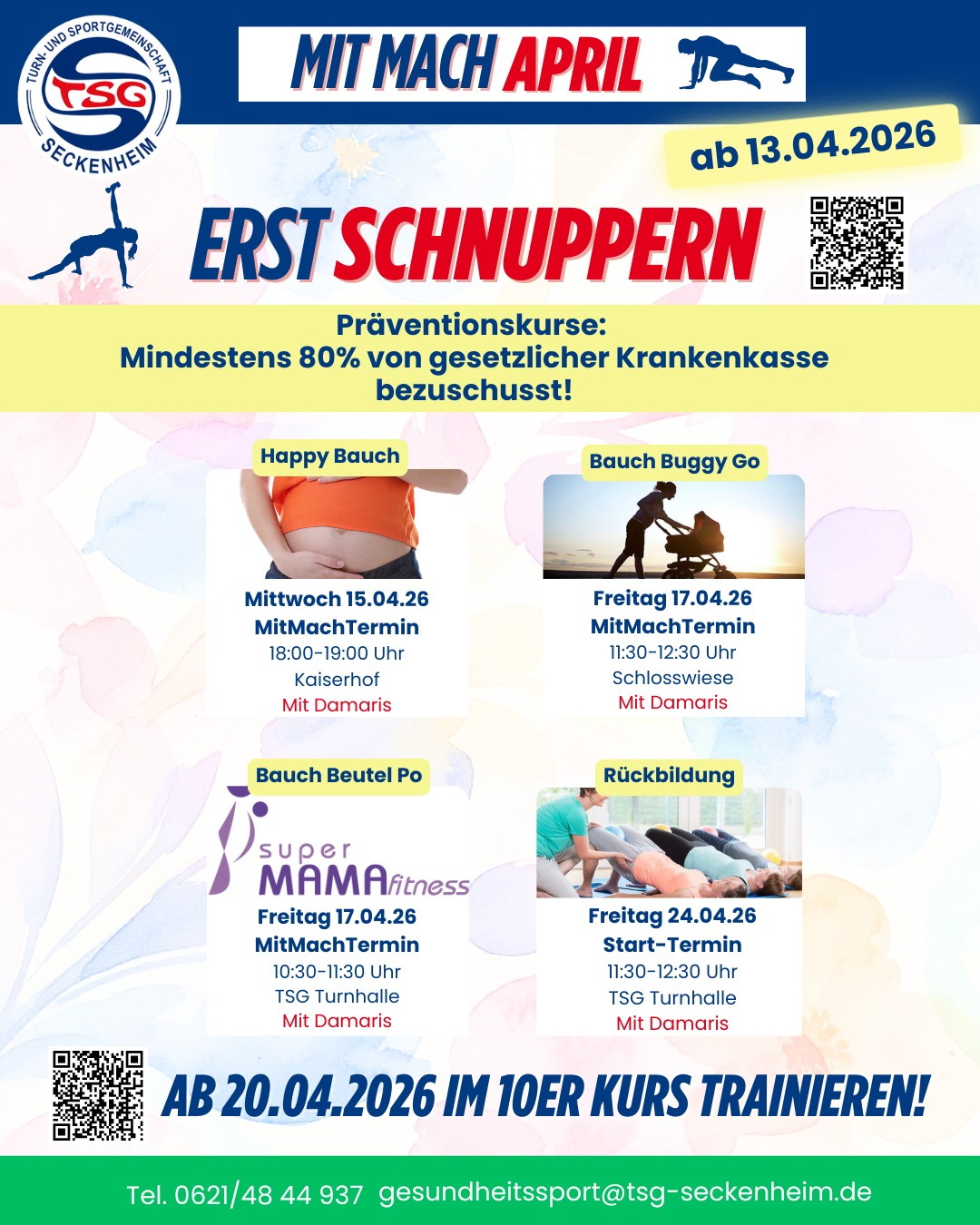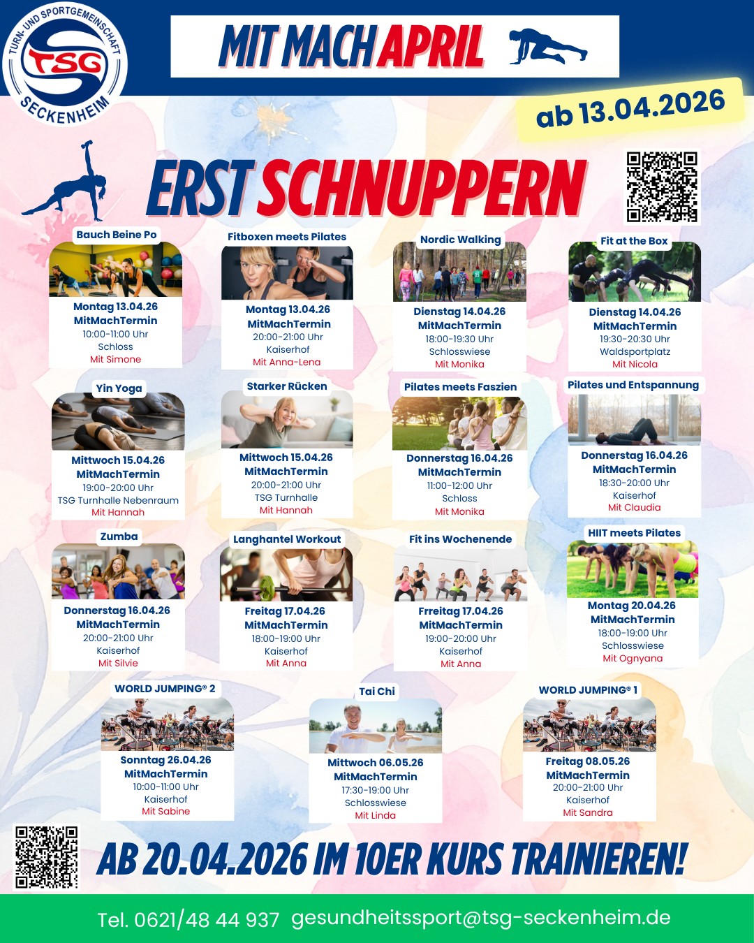 Am 13.04.2026 startet wieder unser MitMachApril mit tollen Schnupperangeboten. Danach laufen dann auch schon die nächsten 10er Kurse im Gesundheitssport!