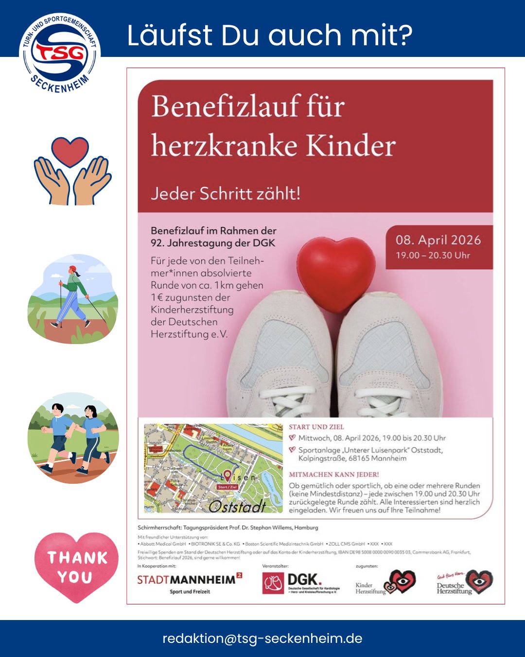 Einige Läuferinnen und Läufer der TSG Seckenheim haben sich den Termin bereits notiert und laufen mit. Wir freuen uns über alle, die mithelfen. Wenn Ihr an dem Tag schon ab unserem Treffpunkt dabei sein wollt: schreibt gerne eine Mail an redaktion@tsg-seckenheim.de und wir senden weitere Infos! 💙🤍❤️
