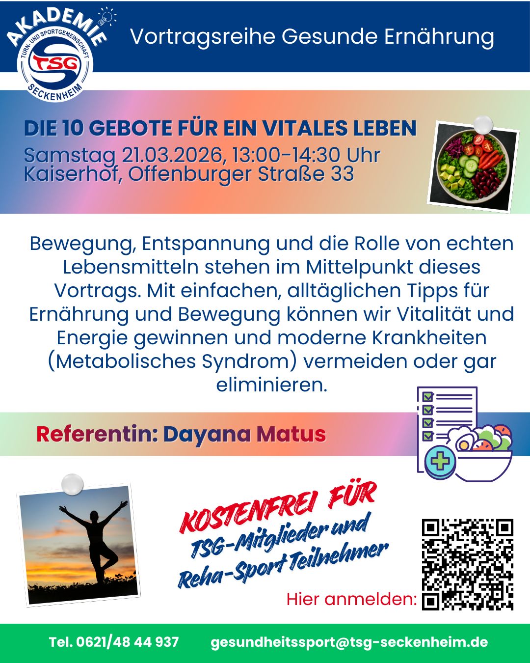 Der erste Vortrag umfasst "10 Gebote für ein vitales Leben". Im Mittelpunkt dieses Vortrags stehen Bewegung, Entspannung und die Rolle von echten Lebensmitteln. Mit einfachen, alltäglichen Tipps für Ernährung und Bewegung können wir Vitalität und Energie gewinnen und moderne Krankheiten (Metabolisches Syndrom) vermeiden oder gar eliminieren. Hier erfahrt Ihr mehr: www.tsg-seckenheim.de