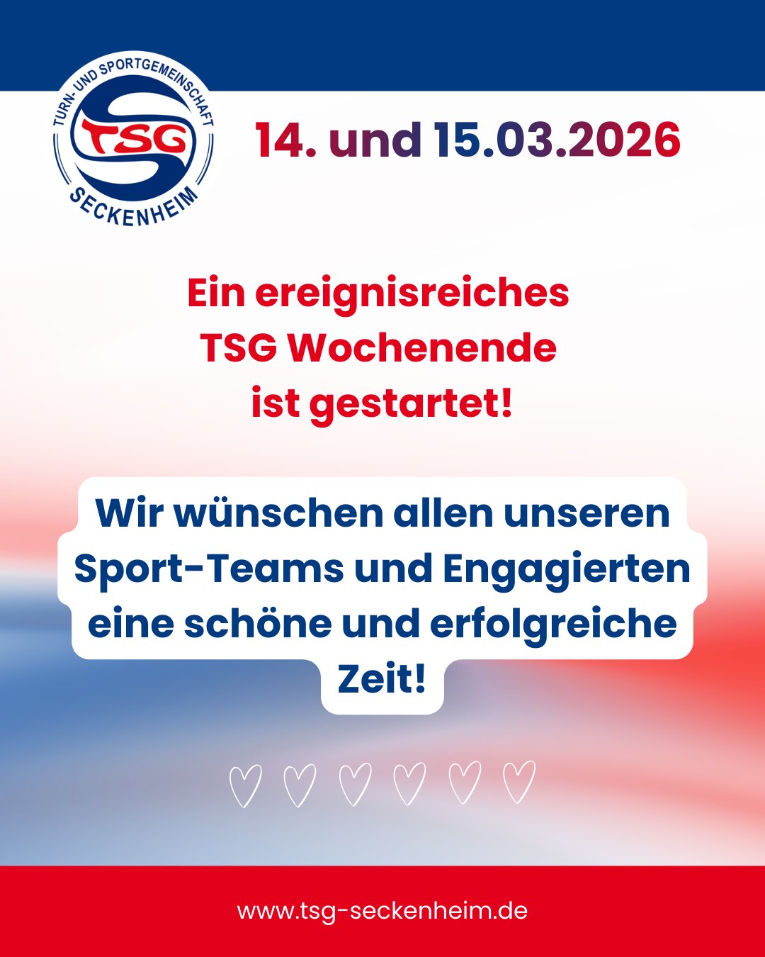 Wir machen ab 22.12.2025 eine kurze Winterpause und sind am 07.01.2026 wieder wie gewohnt erreichbar. In dringenden Fällen bitte eine Mail schreiben an: info@tsg-seckenheim.de.