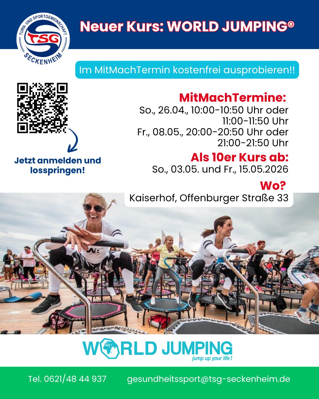 "WORLD JUMPING®" kommt zur TSG Seckenheim ins Gesundheitsstudio Kaiserhof. Nutzt die kostenfreien Schnuppertermine und probiert es einfach mal aus. Jetzt noch schnell anmelden 🤩