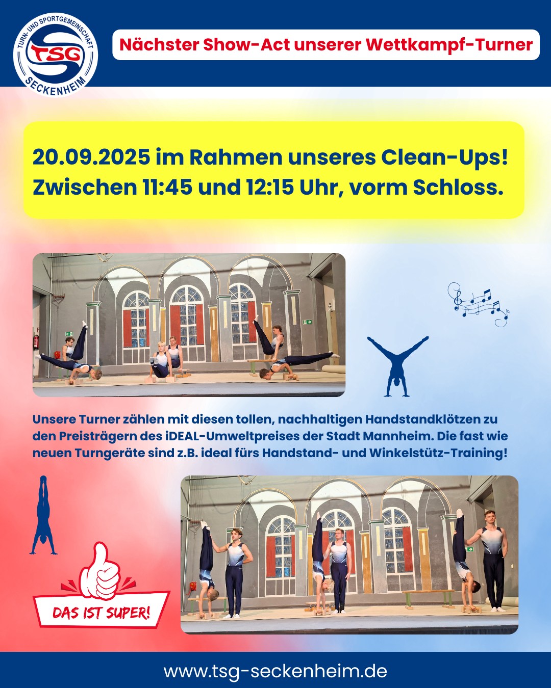 Unsere Wettkampfturner zählen zu den Preisträgern des iDEAL-Umweltpreises 2025 der Stadt Mannheim: denn sie haben nachhaltig gezeigt, wie aus alten Barrenholmen fast wie neue Handstandklötze werden können. Wir freuen uns, dass unsere Turner mit einem Showact auch bei unserem Clean Up dabei sein werden!