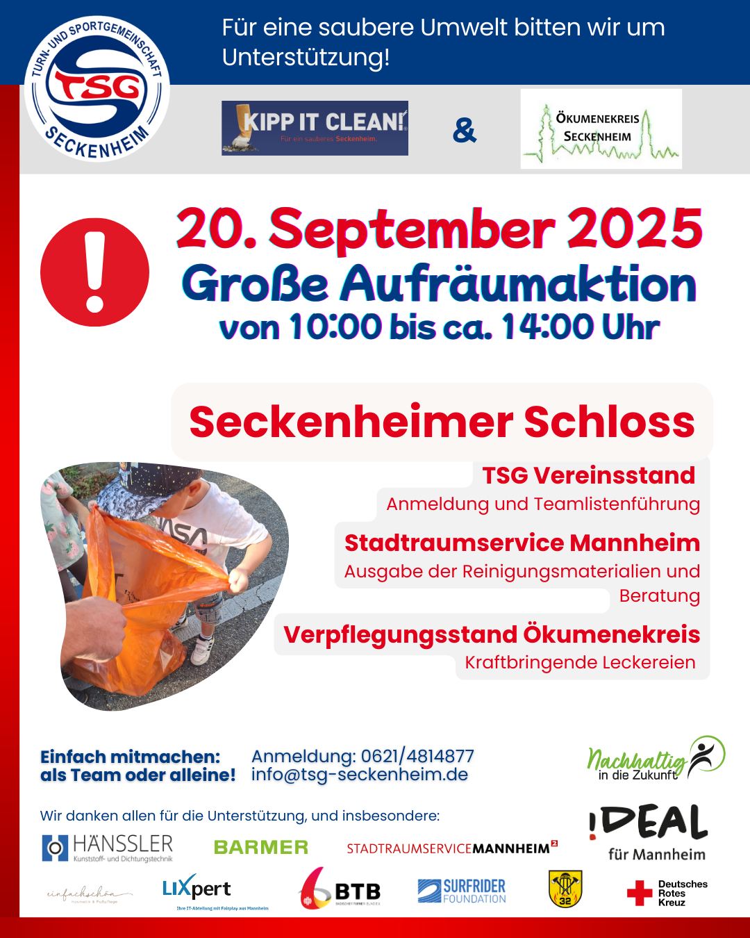 🌍💪 Seid beim 4. Clean Up der KIPP IT CLEAN Kampagne der TSG Seckenheim dabei, die zum 2. Mal in Kooperation mit Ökumenekreis Seckenheim stattfinden wird --> am 20.09.2025, am World Clean Up Day 2025!