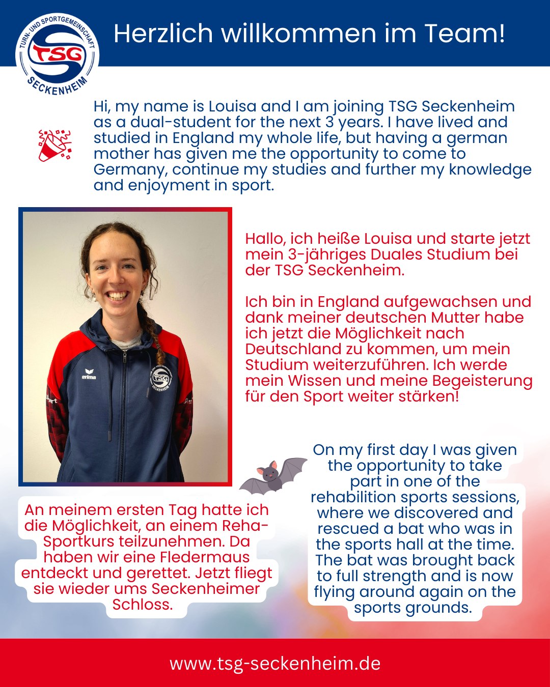 Wir freuen uns sehr, mit Louisa eine Duale Masterstudentin in Trainingswissenschaften und Sporternährung für die TSG Seckenheim gewonnen zu haben - herzlich willkommen im Team! 🤩💙🤍❤
