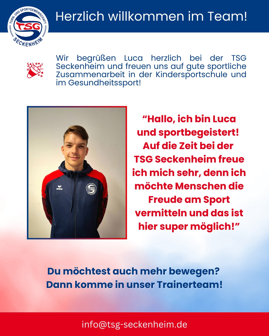 Wir wachsen weiter – und mit uns auch unser Trainerteam! 💪✨ Willkommen bei der TSG, Luca – wir wünschen dir einen tollen Start!