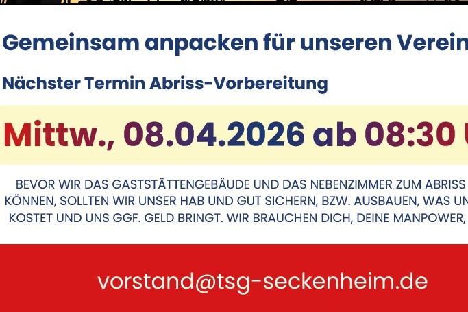 Am 08.04.2026 gehen die Abriss-Vorbereitungen an der TSG Turnhalle weiter und wir brauchen wieder jede helfende Hand.